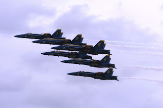 The Blue Angels ended their show with a final salute as they flew in toward us in formation and then each flew off in a different direction. We in the crowd saluted them as well with a raucous round of cheers and whistles and applause...